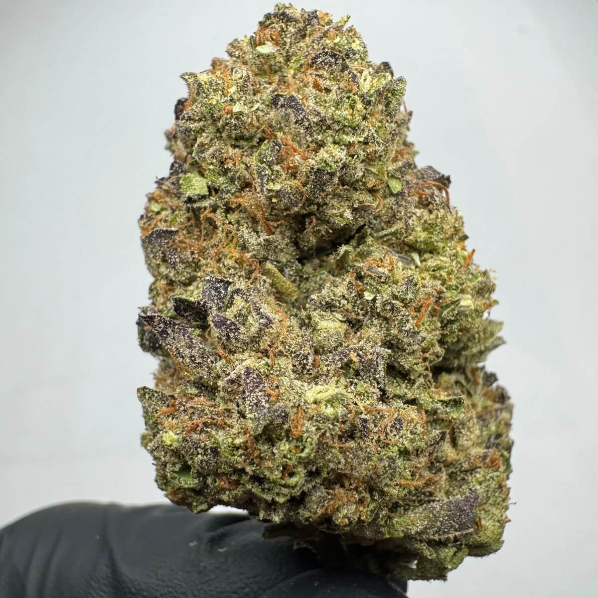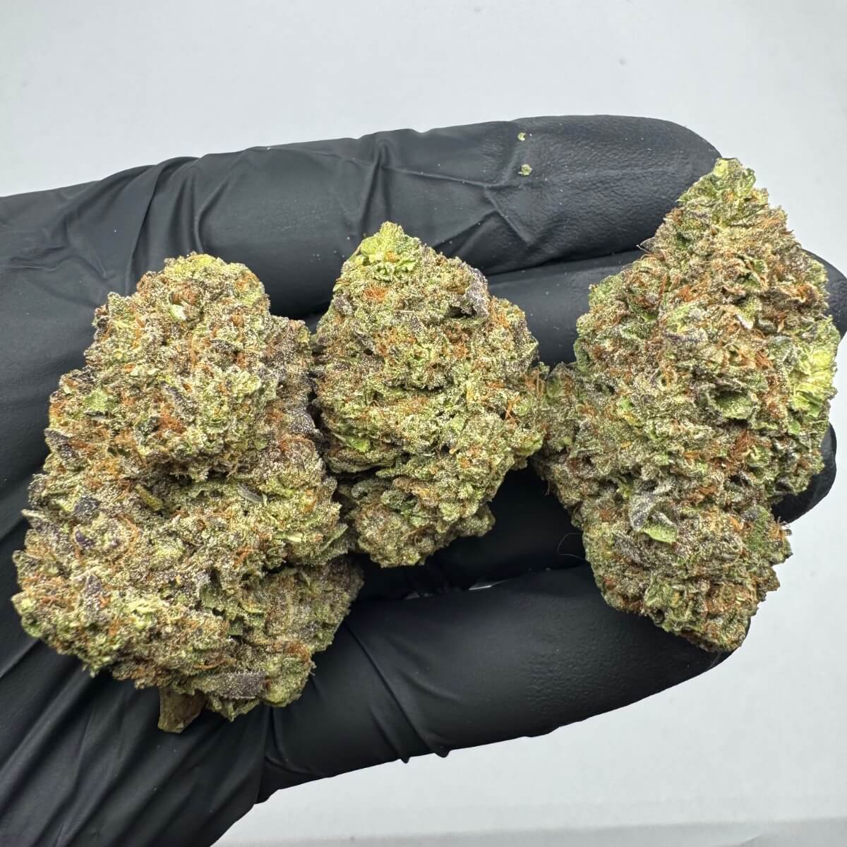 Obama Runtz THCa buds are dense, chunky, and beautifully frosted in trichomes. The nugs feature a striking mix of deep purples, dark greens, and bright orange pistils, with a sticky, resin-rich texture.